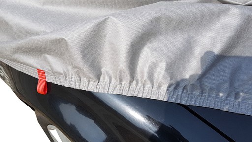 Pokrowiec wyposażony został w gumy ściągające zachodzące pod zderzaki auta, które zapewniają natychmiastowe umiejscowienie pokrowca na pojeździe. Dodatkowo po obwodzie pokrowca przebiega gruby pas mocujący przewlekany przez oczka, który zapewnia niezawodne zabezpieczenie przed silnym wiatrem.