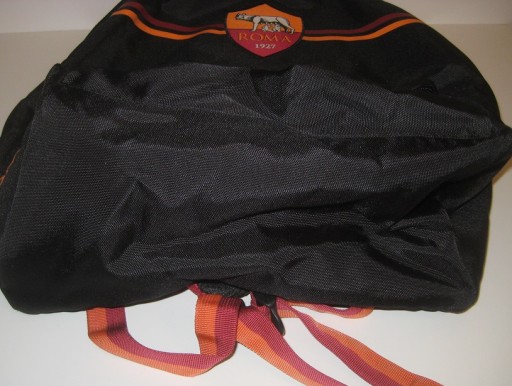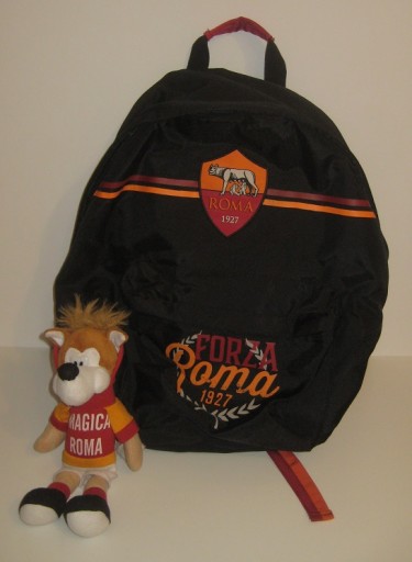 Plecak + maskotka Magica Roma - w barwach AS Roma. Produkt oryginalny. Kolor: czarny. Wymiary plecaka: wysokość 41 cm, szerokość 35 cm, głębokość 14 cm. Posiada 1 komorę z wewnętrzną zamykaną kieszenią i 1 kieszeń zamykaną zewnętrzną. Używany. Stan ładny - jak na zdjęciach. Z Włoch. Cena za komplet.