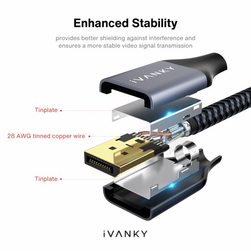 Najwyższa niezawodność i trwałość - wysokiej jakości pleciona osłona z nylonu o żywotności ponad 30 000 zgięć. Nowy kabel DP iVANKY ma w pełni ekranowaną strukturę, aby zapobiec zakłóceniom EMI. Doskonała konstrukcja z pozłacanymi złączami z blachą ocynowaną, aluminiową powłoką, cynowanym drutem miedzianym 28 AWG oraz ekranowaniem z folii i plecionki, zapewniającym wytrzymałość i stabilną transmisję sygnału wideo