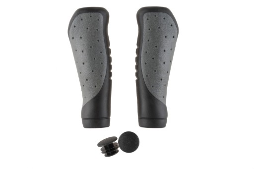 Chwyt kierownicy został wykonany z antypoślizgowej i lekkiej gumy, dzięki czemu ręka prawidłowo przylega do kierownicy i pozwala na pewne prowadzenie roweru podczas jazdy. Ergonomiczny kształt chwytu znacząco podnosi komfort jazdy. Chwyt z dwoma otworami, pozwala na swobodny montaż rogów kierownicy. Chwyt o długości 130 mm w kolorze szaro-czarnym.