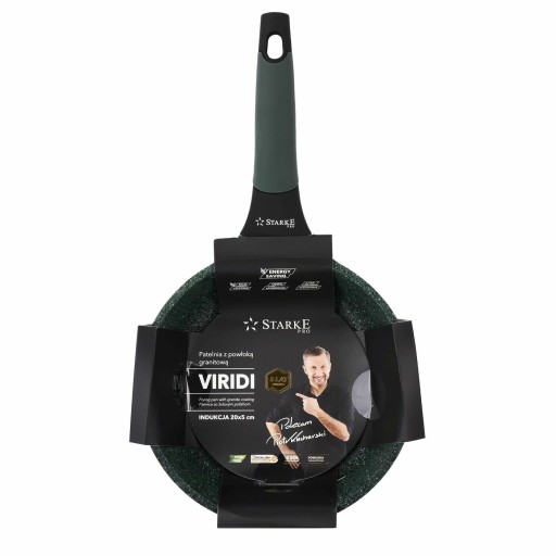 Uniwersalna patelnia marmurowa na indukcję Starke Pro Viridi 20 cm wykonana jest z aluminium. Do jej stworzenia wykorzystano technikę jednorodnego odlewu die cast. Dzięki temu jest świetnie wyważona i bardzo wytrzymała pod względem mechanicznym oraz termicznym. Podwyższoną trwałość zapewnia jej również żaroodporna farba silikonowa, którą pokryto korpus z zewnątrz. Wnętrze patelni wykończono powłoką marmurową GREBLON C3 wzbogaconą o drobinki granitu. Jej wysoka jakość, doskonała przyczepność, twardość, oraz 3-warstwowa struktura zostały opracowane przez niemiecką firmę WEILBURGER. Ma też oznaczenie PFOA Free. Energooszczędność zapewnia dno indukcyjne o grubości 4,5 mm. To dzięki niemu możesz używać patelni marmurowej Viridi 20 cm na każdej kuchence. Powłoka nieprzywierająca umożliwi ci dodatkowo smażenie na niewielkiej ilości tłuszczu oraz bezproblemową pielęgnację. Zniesie przy tym aż 8000 cykli ścierania, czyli czterokrotnie więcej niż zwykłe patelnie non-stick dostępne na rynku. Przenoszenie i użytkowanie modelu ułatwia rączka soft touch, która się nie nagrzewa i nie wyślizguje z dłoni. Stworzysz z nią swój własny zestaw naczyń kuchennych z serii Viridi – do domowego użytku poleca ją Piotr Kucharski, który osobiście sprawdził możliwości oraz jakość patelni marmurowej. Produkt ma 5 lat gwarancji.