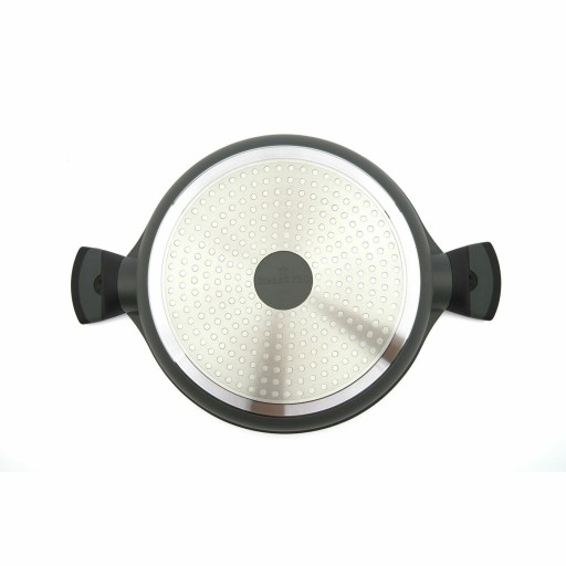 Pozostałe informacje: - patelnia z aluminium, odlewana, - pokryta powłoką Greblon C3 z dodatkiem granitu, - powłoka trójwarstwowa marmurowa, - 8000 cykli ścierania, - grubość powłoki: 40- 45 um, - grubość brzegu: 6,5 mm, - grubość ścianki: 1,8 mm, - grubość dna: 4,5 mm, - zewnętrzna strona patelni pokryta żaroodpornym silikonem, - PFOA free, - uchwyty typu soft touch pokryte silikonem, - pokrywa szklana z silikonowym rantem, - odpowietrzniki w rancie pokrywy, - uchwyt pokrywy bakelitowy pokryty silikonem, przykręcany, - 5 lat gwarancji