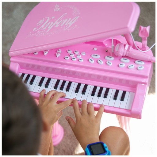 NN PIANINO KASIA to elektroniczny fortepian dla dzieci w zestawie z mikrofonem i krzesełkiem. Instrument posiada 37 mini-klawiszy idealnie dopasowanych do małych rączek. Organy oferują szereg ciekawych brzmień, podkładów muzycznych i funkcji, dzięki którym najmłodsi świetnie się bawią. Grę można ćwiczyć samemu albo podłączyć do klawiszyzewnętrzny odtwarzacz muzyki lub smartfon i grać do swoich ulubionych piosenek. Dołączony mikrofon pozwala na zabawy karaoke, a funkcja nagrywania i odtwarzania utworów sprawia, że dzieci mogą poczuć się jak prawdziwe gwiazdy! Ważnym elementem edukacyjnym jest 8 rodzajów instrumentów, akompaniamenty, dzięki którym nasze dzieci poznają różne style muzyczne, a także możliwość zmiany tempa samego podkładu i ćwiczenia rytmiki. Pianino Kasia to wymarzony prezent wielu dzieci. To także stosunkowo tani keyboard-fortepian, którego najlepszą cenę i szybką realizację wysyłki gwarantuje sklep muzyczny Music Express!
