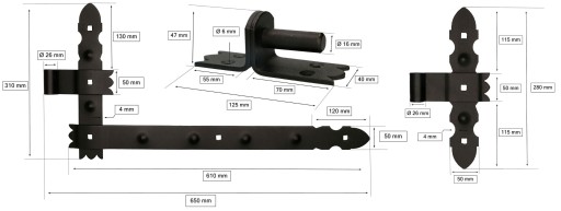 - Zestaw zawiera 4 zawiasy, 6 czopów i 2 zawiasy środkowe.