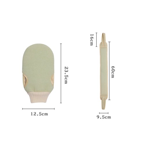 zestaw zawiera: rękawicę do mycia dwustronna z wycięciem na kciuk, pas do mycia pleców o przybliżonej długości 84 cm, co sprawi wygodne mycie przede wszystkim pleców oraz myjkę standardowej wielkości.