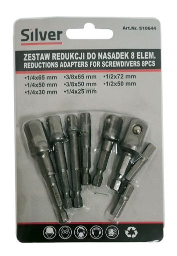 Zestaw specjalistycznych redukcji, adapterów do wkrętarki. Redukcje pozwalają na pracę wkrętarką z nasadkami. Elementy zestawu wykonane są ze stali narzędziowej, która gwarantuje ich wytrzymałość i długą żywotność.