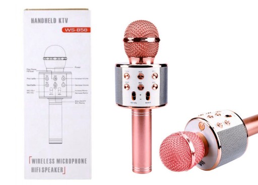Mikrofon WS858, który można połączyć z telefonem komórkowym lub innymi urządzeniami poprzez Bluetooth! Mikrofon posiada rozbudowany panel, pozwalający na zmianę odtwarzanych utworów, zatrzymywanie ich, sterowanie poziomem głośności melodii w tle, śpiewu oraz stopniem remiksu obu dźwięków.