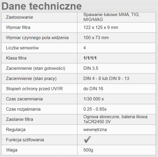 Filtr umożliwia płynną regulację stan zaciemnienia (DIN 4 -8 / DIN 9 – 13) , czułości i opóźnienia.