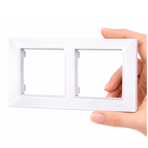 Ramka podwójna serii Simon 10 w kolorze białym, marki Simon. Przeznaczona jest do dekoracyjnego maskowania podtynkowych łączników i gniazd serii Simon 10 w układzie pionowym lub poziomym. Ramka została wykonana z wysokiej jakości tworzywa sztucznego, co gwarantuje jej trwałość przez długi okres użytkowania