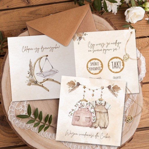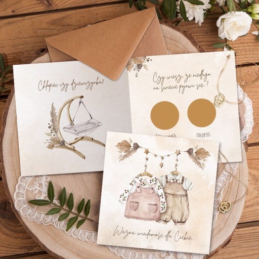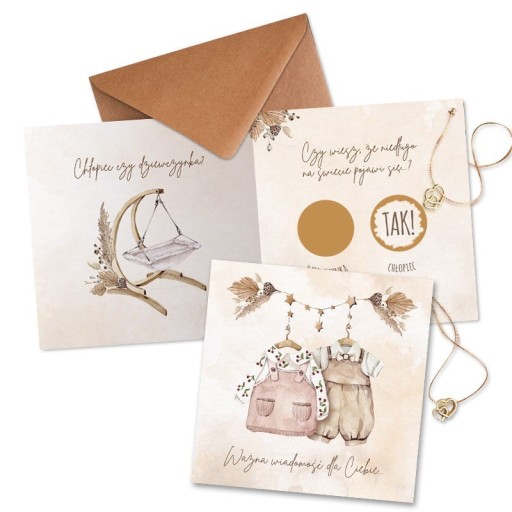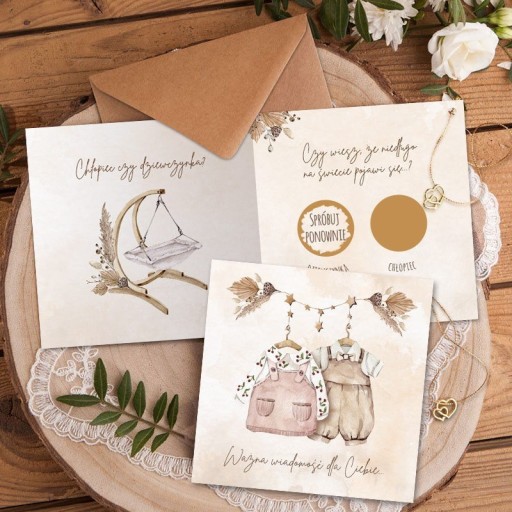 - nadruk: matowy, grafika w stylu boho przedstawiająca na pierwszej stronie dwa ubranka (chłopięce oraz dziewczęce) zawieszone na wieszaku, wewnątrz po lewej stronie znajduje się boho kołyska oraz bukiecik z suszu, z prawej znajdują się dwie złote zdrapki pod którymi ukryta jest informacja o płci dziecka (wersja dla chłopca!) - pod zdrapką z napisem Chłopiec znajduje się słowo: TAK, natomiast pod zdrapką z napisem Dziewczynka znajduje się słowo: SPRÓBUJ PONOWNIE