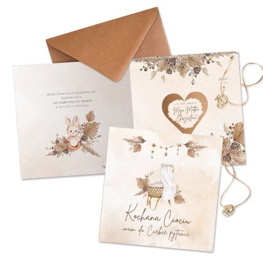 Piękna prośba zdrapka na Chrzest Święty dla przyszłej Matki Chrzestnej! Wspaniała propozycja na poproszenie cioci o zostanie Matką Chrzestną maluszka. Prośba jest ozdobiona boho wzorem kołyski dla dziecka oraz zdrapką. Całość wygląda niesamowicie i jest oryginalnym pomysłem zaproszenia na Chrzciny.