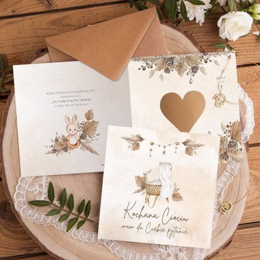 - nadruk: okładka prośby zdobiona jest grafiką boho kołyski, we wnętrzu znajduje się uroczy tekst o Matce Chrzestnej