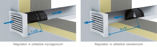 Regulator przepływu powinien znaleźć się co najmniej jedną długość średnicy kanału od kratki wentylacyjnej w układzie wyciągowym powietrza i co najmniej 3 długości średnicy kanału w układzie nawiewnym.