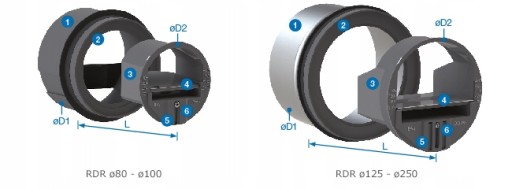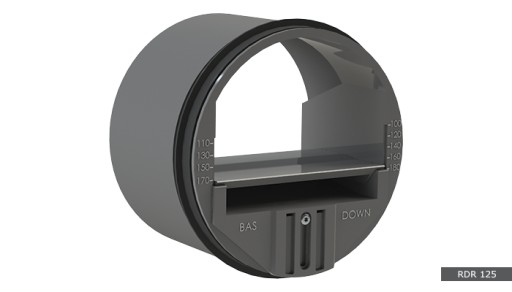 Regulator wykonany jest z tworzywa sztucznego PVC w klasie M1 oraz stali ocynkowanej (dla ø150-250 mm), o wytrzymałości temperaturowej do 60ºC. Regulator zapewnia utrzymanie stałej wartości strumienia przepływu powietrza w zakresie ciśnienia 50-250 Pa. Lindab RDR może być stosowany zarówno w trybie nawiewu, jak i wyciągu powietrza.