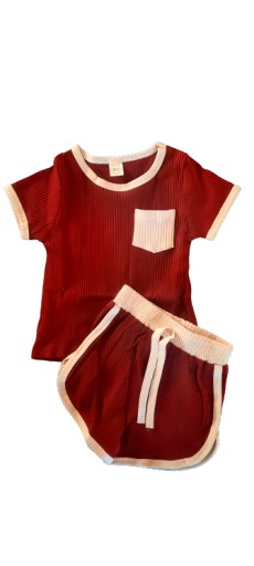 Komplet na lato dla dzieci. Materiał : bawełna. Rozmiar 90cm. Komplecik w kolorze bordowym z elementami ozdobnymi w kolorze beżowym.