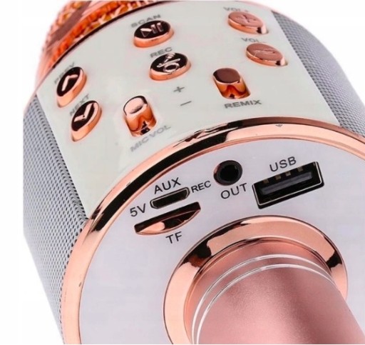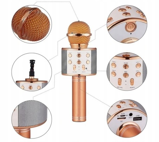 Ten mikrofon karaoke wygląda modnie i stylowo, działa profesjonalnie, wykonany ze stopu aluminium, elegancki, trwały i stylowy, z wykorzystaniem najnowszej bezprzewodowej technologii Bluetooth 4.0 , mikrofon z technologią redukcji szumów. Wysokiej jakości inteligentny układ miksujący z 3-warstwową głowicą filtra przeciwzakłóceniowego, zapewnia wyraźny pogłos i najniższy poziom hałasu, płynnie miksuj swój głos z muzyką, podnieś swój głos do najwyższego poziomu. Mikrofon z dwoma głośnikami . Umożliwia odsłuchiwanie oraz nagrywanie piosenek . podczas śpiewania mikrofon umożliwia regulację siły głosu, podkładu muzycznego, siły basów, sopranów