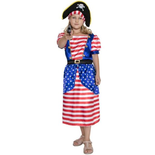 Kolorowy strój Piratki dla Twojego dziecka! Idealny kostium na szkolny bal maskowy czy karnawałowy. Zestaw zawiera biało-czerwoną sukienką w pasy, ozdobioną niebieską kamizelką w gwiazdki, dodatkowo kapelusz na głowę z wizerunkiem czaszki pirackiej. Cały kostium wygląda bardzo realistycznie, idealny dla buntowniczej dziewczynki lub nieodrodnej córki prawdziwego wilka morskiego.