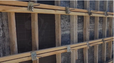 Krok 2 - Odległość pomiędzy płytami deskowania należy ustawić według projektu a następnie rozstaw ustabilizować przy pomocy kawałków desek w celu uzyskania jednakowej grubości szalowanego elementu na całej jego długości.