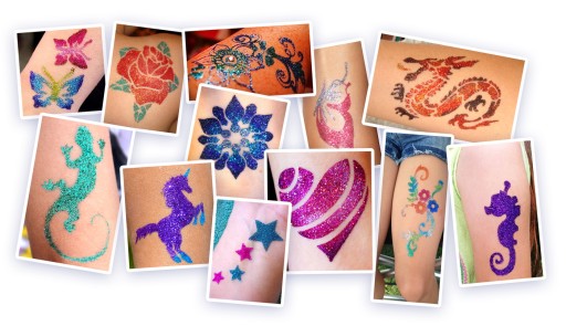 Henna może być stosowana do robienia tatuaży za pomocą szablonów. Można malować stosując samą hennę, jako również wzbogacić gotowy tatuaż pastą brokatową zrobioną za pomocą żelu do brokatu, oraz kolorowych kryształków dostępnych na innych naszych aukcjach.