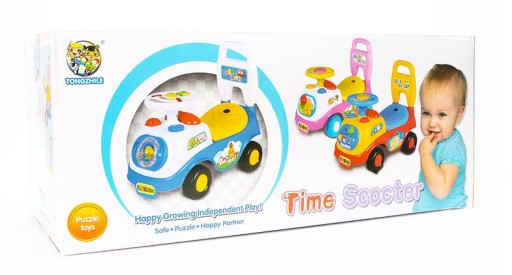 Zabawka w postaci jeździka posiada na przodzie obracającą się kulkę wypełnioną koralikami, które podczas obracania wydają dźwięki co na pewno zaciekawi i zajmie Twojego Malucha.