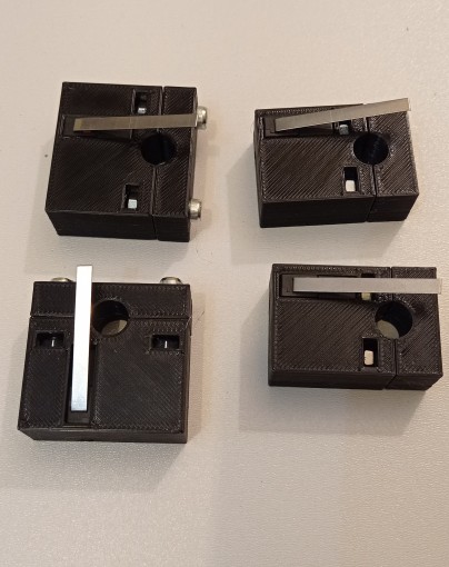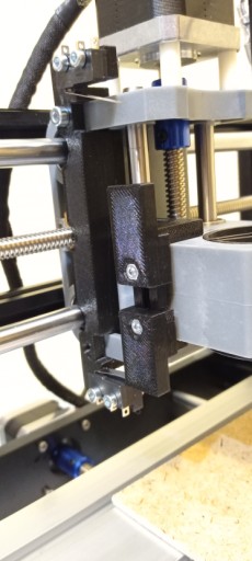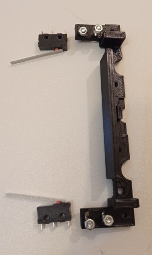Wyłączników krańcowych na oś X i Y (po 2szt.)- montowane są na jednej z prowadnic liniowych (wałek). Składają się z dwóch części, w większej montowany jest wyłącznik krańcowy. Można je zamontować w dowolnym miejscu przesuwając po prowadnicy ,a następnie skręcając śrubami ( w zestawie). Regulacja zatrzymania możliwa jest tylko poprzez zmianę pozycji krańcówki na prowadnicy liniowej. W przypadku montażu na końcach prowadnic wyzwolenie nastąpi około 15 mm od końca zakresu osi.