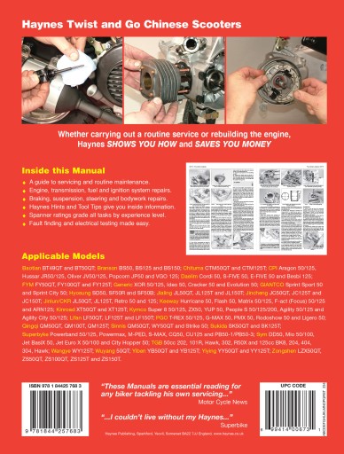 W książce opisano skutery chińskie, tajwańskie i koreańskie z silnikami o pojemności 50 cm3, 100 cm3, 125 cm3, 150 cm3 i 200 cm3; silniki 2- i 4-suwowe, gaźnikowe, z automatyczną skrzynią biegów. Książka zawiera historię modelu, przygotowanie skutera do jazdy, szczegółowe dane techniczne, informacje o przeglądach okresowych, specyfikacje modelu, praktyczne porady i tricki.