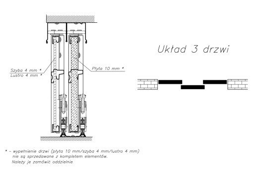 - Zestaw okuć na 3 drzwi przesuwnych, dwa skrzydła płyta meblarska 10 mm, jedno skrzydło szyba / lustro 4 mm