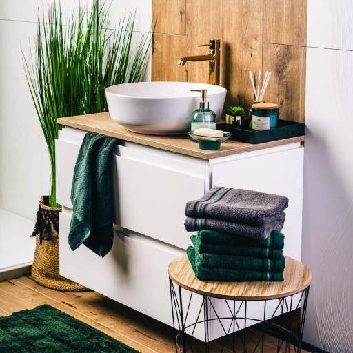 Przeznaczenie:Ręcznik, który poza chłonnością i miękkością, cechuje elegancja i dobry wygląd, to podstawowe wyposażenie łazienki, każdego kto ceni sobie komfort na równi z estetyką wnętrza. Właśnie te cechy łączy w sobie ręcznik Samine, który na tle pozostałych ręczników wyróżnia się, bardzo modnym ostatnio, wzorem marokańskiej koniczyny.Cechy charakterystyczne:Ręcznik Samine w ciemnym, zielonym kolorze, poza ciekawą barwą, zdobi również wzór marokańskiej koniczyny, nadający ręcznikowi orientalny charakter. Wymiary ręcznika, które wynoszą 50 cm x 90 cm, dają wiele możliwości jego zastosowania. Można go z powodzeniem wykorzystać jako ręcznik do włosów, ale także mniejsza i zarazem lżejsza alternatywa klasycznego, dużego ręcznika kąpielowego. Jest on bardzo delikatny dla skóry, dzięki czemu możemy otulić się nim po relaksującej kąpieli. Materiał:Do wykonania ręcznika użyto bawełnę o gramaturze 500 g/m2. Sprawia to, że jest on niezwykle mięsisty, miękki a jednocześnie chłonny. Bawełna, jako Materiał naturalnego pochodzenia, jest przyjazna dla skóry oraz odpowiednia dla alergików. Aby ręcznik zachował swoje właściwości należy go prać w temperaturze nieprzekraczającej 40?C.