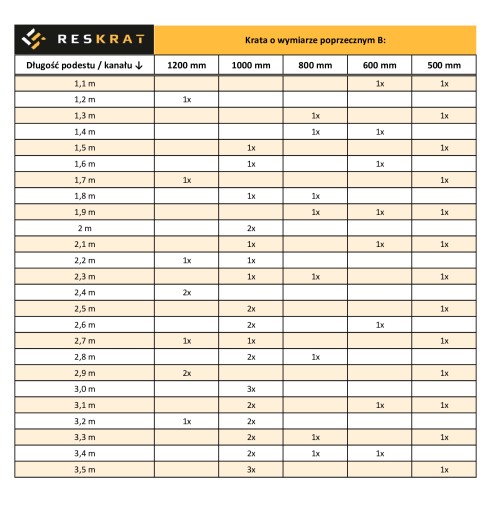 Zbuduj podest / pokrycie kanału z krat dostępnych na naszym magazynie. Sprawdź ile i jakich krat potrzebujesz do pokrycia podestu o danej długości.