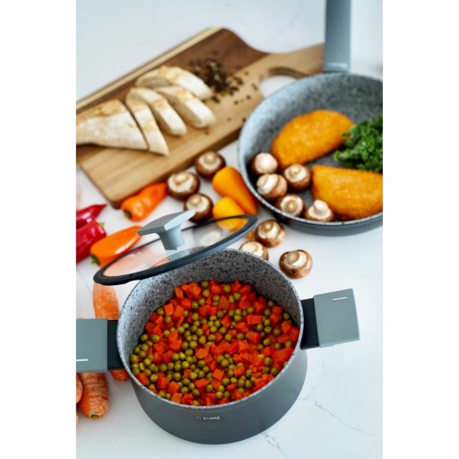 Pozostałe informacje: - garnek z kutego aluminium pokryty powłoką Multistone o szorstkiej teksturze, wysokiej odporności na ścieranie i zarysowania, - powłoka trójwarstwowa, - 10 000 cykli ścierania, - grubość dna: 3,4 mm, - grubość ścianki: 2,2 - 2,5 mm, - grubość brzegu: 3 - 4 mm, - antypoślizgowy uchwyt soft touch, bakelitowy pokryty powłoką silikonową, - PFOA free, - pokrywa szklana z silikonowym rantem i odpowietrznikiem wykończonym stalą nierdzewną, - uchwyty przykręcane