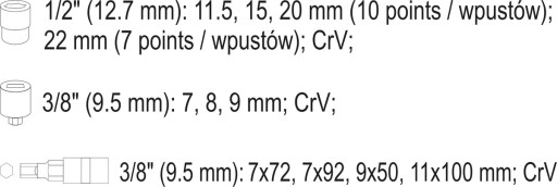 - nasadki specjalne 3/8' hex7mm/8mm/9mm;