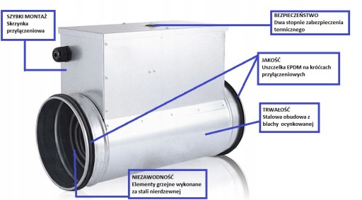 Obudowa nagrzewnicy wykonana jest z blachy stalowej ocynkowanej, elementy grzejne wykonane są ze stali nierdzewnej. W zewnętrznej skrzynce przyłączeniowej znajduje się blok przyłączeniowy oraz zabezpieczenia termiczne. Zabezpieczenie przed przegrzaniem stanowi podwójny termostat.