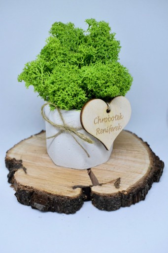 Wymiary ( 5cm x 5cm x 5cm wymiary doniczki bez mchu ok 5-6cm mech) z najwyższej jakości zielonego w kolorze: wiosenna zieleń ( jednokolorowego), gęstego i naturalnie impregnowanego fińskiego mchu chrobotek reniferowy. Doniczka wykonana ręcznie z betonu architektonicznego.