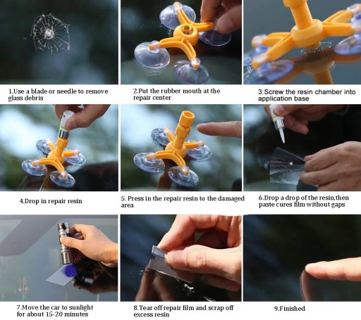 Dzięki temu zestawu samodzielnie naprawisz szybę w Twoim samochodzie. Łatwo i szybko pozbędziesz się odprysków spowodowanych najczęściej przez uderzenia kamieni spod kół innych samochodów. Odpryski i głębokie rysy powstałe w wyniku pęknięć staną się prawie niewidoczne, a szyba zostanie zabezpieczona przed dalszym powiększaniem się uszkodzenia. Nadaje się do naprawy uszkodzeń szyb w kształcie niewielkich oczek, raz podłużnych pęknięć nie dłuższych niż 15cm. Dzięki dużej ilości kleju w zestawie zestaw nadaje się do wielorazowego użytku. Zwraca się przy pierwszym użyciu, koszt naprawy je wielokrotnie niższy niż w autoryzowanych serwisach samochodowych. Szybki efekt - cała procedura aplikacji kleju trwa kilka minut, a sam klej zasycha już w przeciągu 10 min od wystawienia go na działanie promieni słonecznych (klej UV).