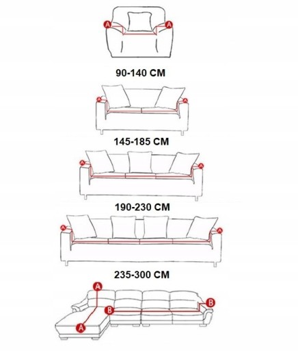 Przy wyborze pokrowca prosimy dokładnie zmierzyć kanapę zgodnie ze schematem pokazanym na zdjęciu