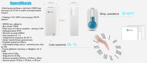 - Łatwa w użytkowaniu: - wystarczy że włożysz ręce a suszarka automatycznie się włączy