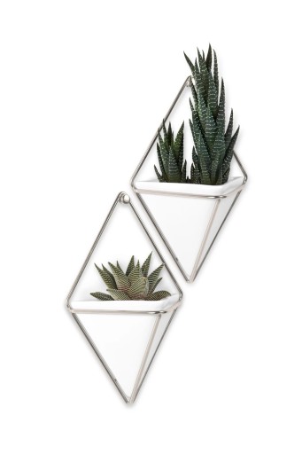 Taki jest komplet 2 małych pojemników Trigg, które nadają się do zawieszenia na ścianie (zestaw montażowy w komplecie). Wykonane są z białej ceramiki i umieszczone w stelażach z metalu.