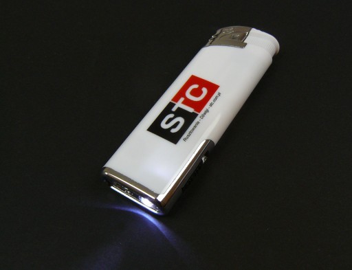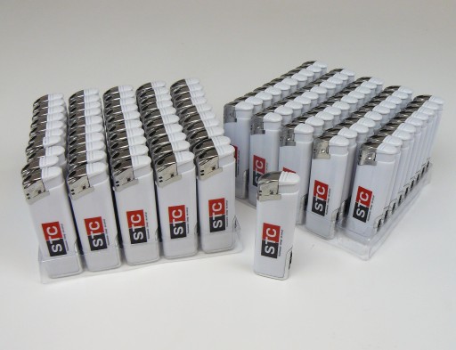 Plastikowe zapalniczki piezoelektryczne, w kolorze białym, z jednostronnym nadrukiem wykonanym innowacyjną technologią druku UV - full color CMYK.