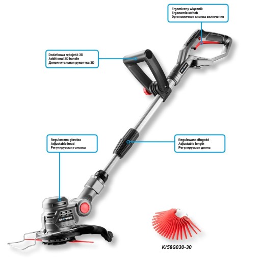 Podkaszarka elektryczna GRAPHITE, współpracująca z akumulatorami 18V Li-Ion GRAPHITE Energy+ to poręczne i funkcjonalne urządzenie do koszenia miejsc, do których zwykła kosiarka nie jest wstanie dotrzeć, takich jak narożniki i krawędzie trawnika, powierzchnie wzdłuż murów lub pod ławkami ogrodowymi. Umożliwia szybkie i łatwe podkaszanie na niewielkich przestrzeniach - szerokość koszenia 254 mm. Wygodny uchwyt, lekka konstrukcja, a przede wszystkim zasilanie akumulatorowe zapewniają komfortową pracę w ogrodzie.
