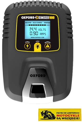 Ładowarka do akumulatorów o mocy do 30Ah. Obsługuje wszystkie rodzaje akumulatorów motocyklowych 12V, włącznie z akumulatorami typu MF. Nowoczesny wygląd połączony z zaawansowanym wyświetlaczem cyfrowym dostarczającym wielu przydatnych informacji takich jak: niewłaściwe podłączenie akumulatora, poziom napięcia, natężenie ładowania, aktualny stan akumulatora oraz status ładowania. Dioda podświetlająca ułatwia zlokalizowanie ładowarki w ciemnych pomieszczeniach. OXIMISER 900 posiada wbudowane zabezpieczenie, chroniące przed zwarciem. Idealnie nadaje się do pobudzania mocno rozładowanych akumulatorów.