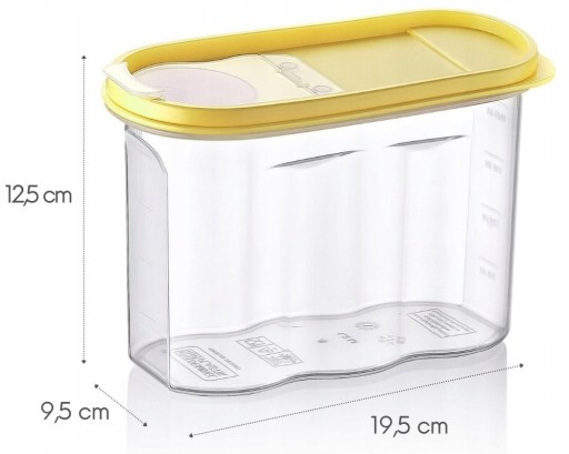 - Pojemnik został wyposażony w czytelną miarkę w ml. Miara ułatwi dozowanie odpowiedniej ilości składników do gotowanych potraw. Pozwoli też na bieżąco kontrolować ilość posiadanych zapasów