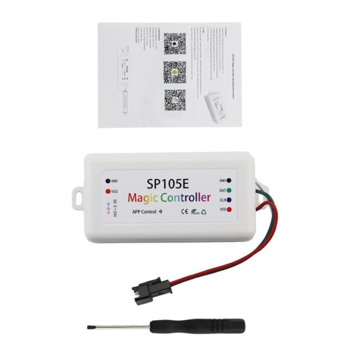 - Sterownik SP105E obsługuje prawie wszystkie jednoprzewodowe lub dwuprzewodowe procesory LED takie jak: WS2811, WS2812B, INK1003, UCS1903, DMX512, LPD6803, LPD8806, APA102, APA105, TM1804, TM1814, TM1914, TM1913, P9813, WS2801, SK6812, SK6812.