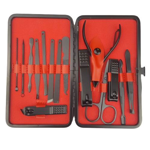 Zestaw do manicure i pedicure 15 elementów. Zestaw do manicure w czarnym eleganckim etui. Środek w kolorze czerwonym. Całość prezentuje się estetycznie i luksusowo. Wszystkie narzędzia wykonane są ze stali nierdzewnej, Zestaw ma wiele funkcji, w tym pielęgnację dłoni, pielęgnację stóp i twarzy. Zestaw do manicure, który nie zajmuje dużo miejsca podczas podróży ani w domu. Z łatwością zmieści się w torebce, samochodzie, bagażu, biurze itp.
