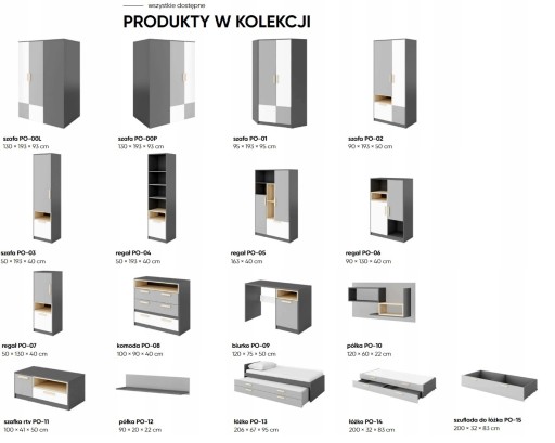 Łóżko możesz skompletować z dwoma rodzajami szuflad: z głęboką szufladą na pościel (PO-15) lub szufladą z dodatkowym materacem i pojemnikiem na pościel (PO-14) – idealną do niewielkiego pokoju rodzeństwa lub dla dzieci, które często podejmują gości.