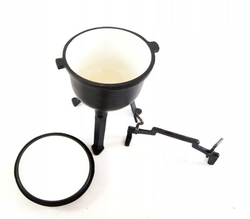 Kociołek 4l został wykonany z żeliwa odpornego na wysokie temperatury oraz ścieranie. Środek kociołka został pokryty grubą warstwą emalii. Kociołek posiada odkręcane nóżki dzięki czemu można go postawić na paleniskach czy piecach, kociołek można postawić lub powiesić nad ogniem za pomocą specjalnego uchwytu. Kociołek jest nowy, nieużywany, oryginalnie zapakowany.