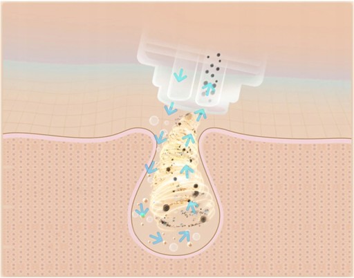 Ultra-mikro przepływ wody tworzy pętlę cyrkulacyjną przez podciśnienie próżniowe, wydobywając nadmiar łoju oraz zanieczyszczenia z porów skóry.