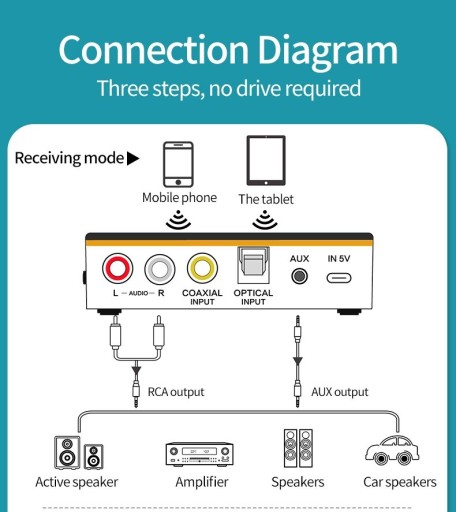 Służy do przekazywania muzyki nadawanej przez komunikację Bluetooth z urządzeń takich jak smartfon czy tablet, do odbiorników typu amplituner, zestaw głośnikowy lub odtwarzacz car audio za pomocą przewodu aux 3,5mm, Toslink lub aux/RCA.
