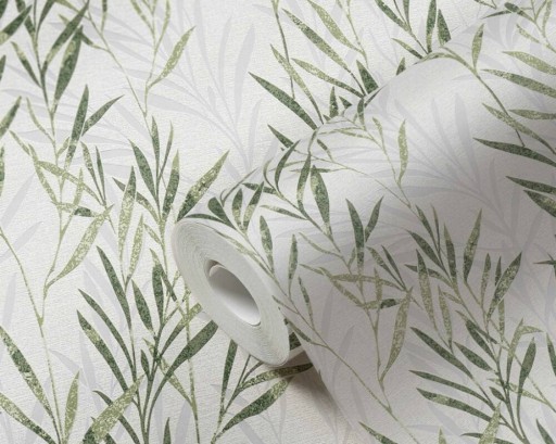 Prezentowana tapeta z motywem liści OLIWNYCH, w odcieniach zieleni, doskonale nadaje się do nowoczesnego wnętrza