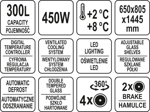 Witryna chłodnicza YATO ma pojemność 300L i posiada trzy półki szklane o regulowanej wysokości mocowania. Dostęp do nich odbywa się za pośrednictwem otwieranych drzwiczek szklanych. Wykonane są one z dwuwarstwowych szyb hartowanych, podobnie jak szyba frontowa i boczne. Zapewnia to dużą wytrzymałość, a jednocześnie bardzo dobre właściwości izolujące.
