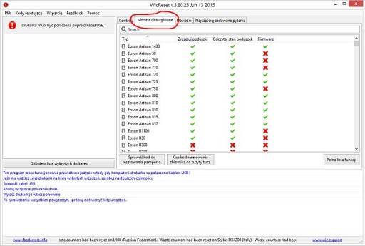W programie jest zawsze najpełniejsza i najbardziej aktualna lista obsługiwanych drukarek i resetowanych przez program funkcji !!!